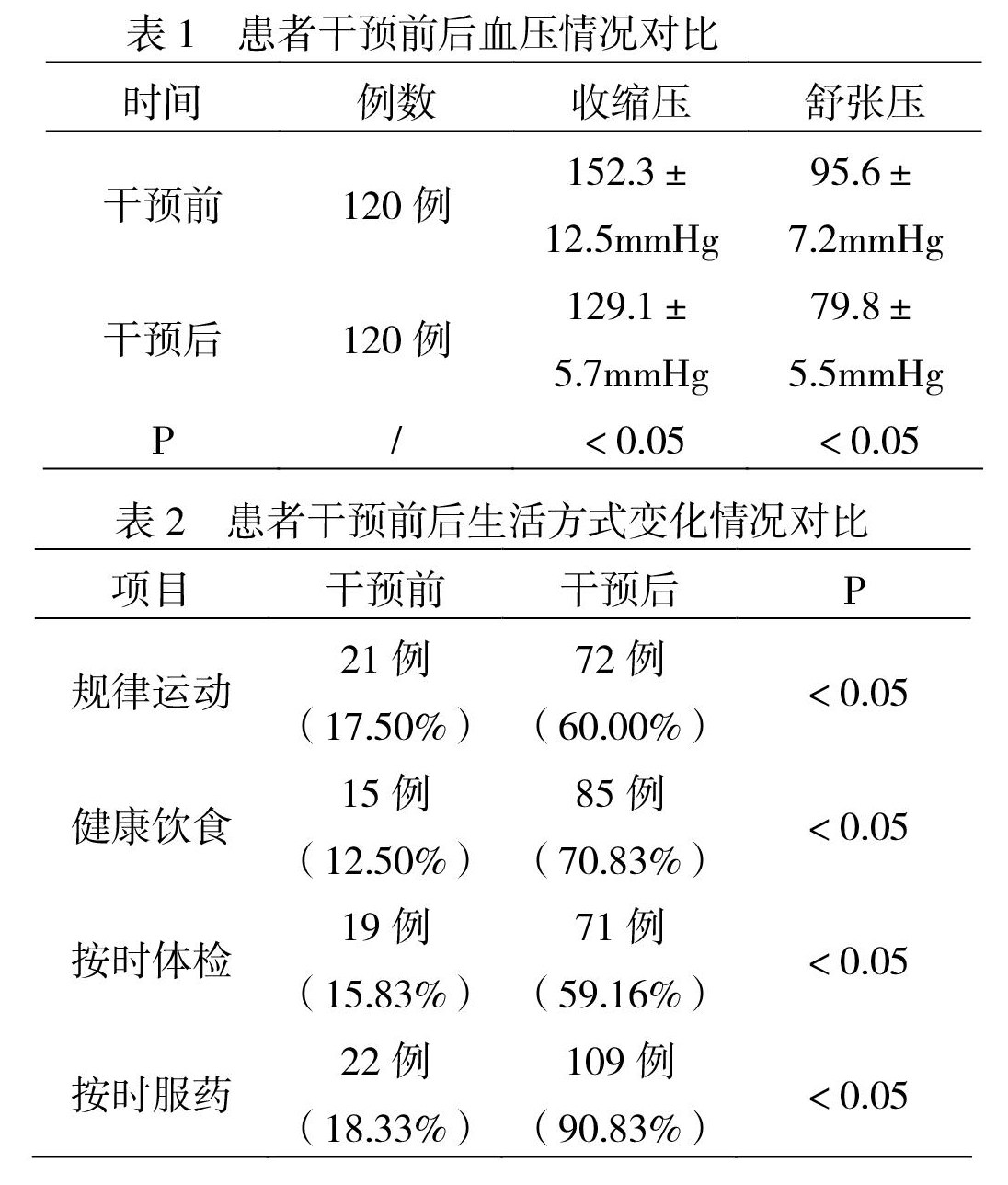 采取综合管理之前,首先记录120例患者现有血压情况及生活方式情况,进一步对患者采取社区高血压综合管理,具体包括:①药物治疗。为患者制定治疗方案,定期规律进行血压检测,观察患者自身情况选取合理药物治疗,选择每日最佳服药时间,指导进行长期定时服药,指导患者观察自身不良反应,根据血压情况及患者具体表现进行药物治疗调整。②健康教育。针对患者现有疾病情况及健康情况采取健康教育,对发病机制、疾病危害进行简单阐述,令患者充分认识后积极配合治疗,以宣传页、宣传讲座、宣传栏方式开展科普教育,指导患者养成良好生活习惯,控制脂肪、糖类和钠盐摄入,进行低盐低脂饮食[3]。③心理干预。为患者开展心理干预,避免疾病为患者带来恐惧、焦虑和抑郁,根据患者现有心理状态情况采取干预,调节患者情绪等综合情况,确保在临床治疗过程中患者身心健康状态得到较好调整。特别对于老年患者来说,要尽可能增加老年患者社会交际,采取积极方法来进行治疗,规律生活,采取积极生活方式。④个性化管理。根据患者现有疾病情况及健康情况,采取个性化管理,根据个体化差异采取运动规划、饮食规划,戒烟限酒,针对患者现有不良生活方式进行纠正,定期随访和督促患者进行自我检测。